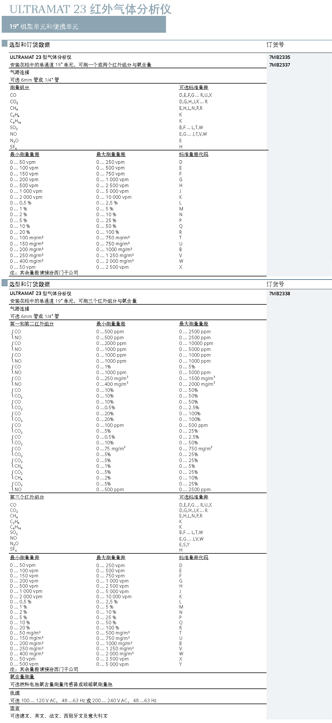 | • 测量二种红外气体组分带(或不带)氧含量测量 | 通过TÜV 认证的ULTRAMAT 23 型气体分析仪可按照13. BlmSchV与TA Luft 中的要求测量CO、NO、SO2 和O2 |